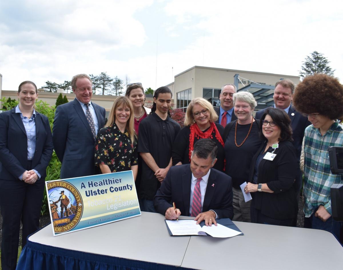 Ellenville, N.Y.-- Today, Ulster County Executive Mike Hein was joined by Commissioner of Health and Mental Health Dr. Carol Smith; County Legislators Kathy Nolan, Tracey Bartels, Brian Woltman; Steve Kelley, President and CEO of Ellenville Regional Hospital, and public health advocates to sign into law landmark legislation raising the age of tobacco purchase in Ulster County to 21. The law, known as Tobacco 21 will take effect on January 1, 2019. Tobacco 21 builds on Ulster County's strong commitment to public health and reducing smoking-related illnesses. Previously, the County Executive worked with the County Legislature to restrict smoking on county-owned property and enhance enforcement of laws prohibiting the marketing of tobacco products to youth.