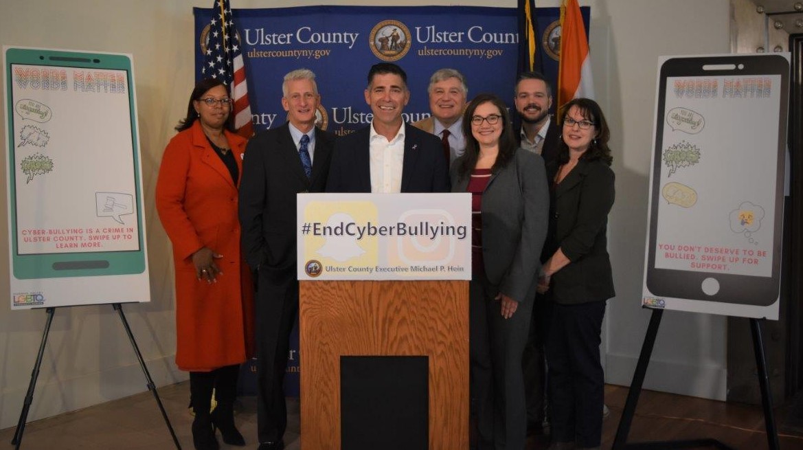 KINGSTON, N.Y. – Today, Ulster County Executive Mike Hein and the Hudson Valley LGBTQ Community Center’s Executive Director Jeff Rindler announced the launch of a new social media campaign aimed at addressing cyberbullying in Ulster County. They were joined by members of the steering committee who assisted in the development of the campaign, consisting of representatives from the Ulster County Attorney’s Office, Ulster County Department of Mental Health, Ulster County Youth Bureau and various school districts. The campaign, which will use the hashtag #EndCyberBullying, is a collaboration between the County Executive` and various County agencies, local school districts and coordinated by the Hudson Valley LGBTQ Community Center.
