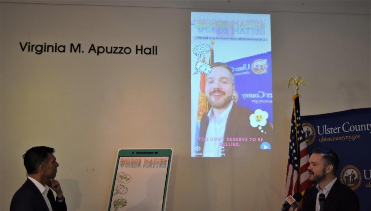 Pictured Above (from left) Nina Dawson, Director of the Ulster County Youth Bureau and Commissioner of Human Rigthts; Jeff Rindler, Executive Director, Hudson Valley LGBTQ Community Center; Ulster County Executive Mike Hein; Robert Fisher, Assistant County Attorney; Kristin Gumaer, Assistant County Attorney; Jake Salt, Director of Program & Services, Hudson Valley LGBTQ Community Center; and Edie Schwimmer, LCSW, Kingston City Schools. Pictured below: Jake Salt, Director of Program & Services, Hudson Valley LGBTQ Community Center presenting a Snapchat Demonstration.
