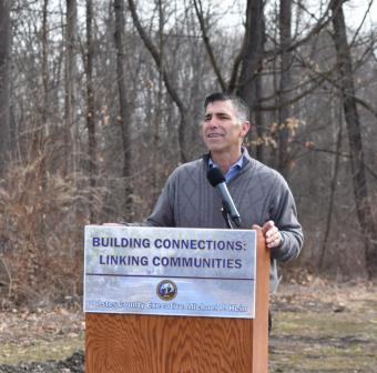Highland, NY: County Executive Michael P. Hein was joined this morning by State and local officials and several dozen trail supporters to announce the start of construction for two construction projects that will extend the Hudson Valley Rail Trail by approximately two miles from its current terminus at Tony Williams Park in Highland to South Street. County Executive Hein was joined by County Legislators Herb Litts and Kathy Nolan, Town of Lloyd Supervisor Paul Hansut, Empire State Trail Director Andy Beers, and Peter Bellizzi, Hudson Valley Rail Trail Association President.