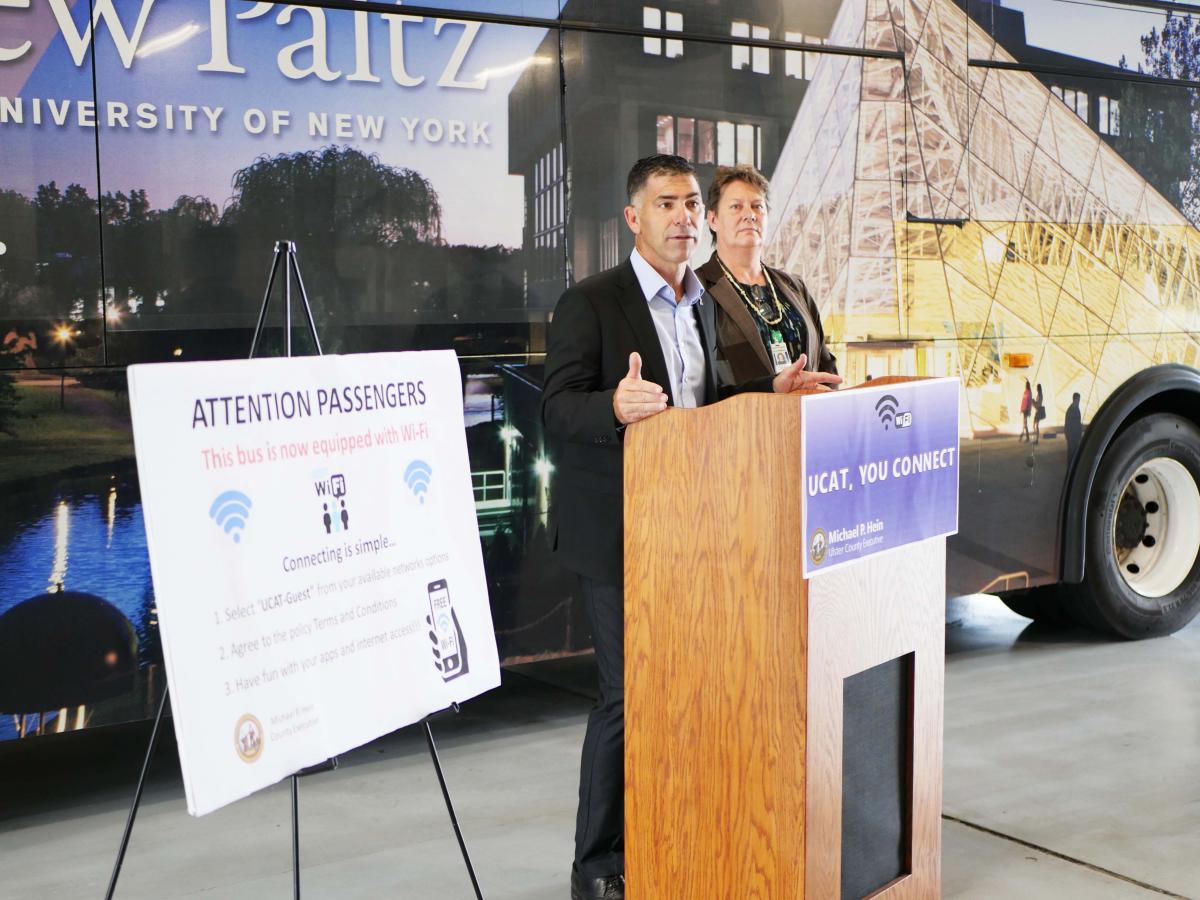 Kingston, N.Y. — County Executive Mike Hein is pleased to announce that all Ulster County buses, including ADA paratransit buses, are now equipped with free WiFi service. The more than 380,000 annual Ulster County Area Transit (UCAT) riders will now be able to access the internet on their smartphones, laptops and other devices at no cost. Since taking office, the County Executive has overseen a number of improvements and a huge increase in annual ridership as well as enhancements to the County’s bus service including: adding new routes that run to the Poughkeepsie Train Station for commuters; a loop service for SUNY New Paltz students; Half Fare rates for SUNY students and Ulster County Veterans; replacing aging busses with smaller more environmentally friendly and efficient buses; and developing a UCAT smartphone app which tells individuals exactly where their bus is and when it will be arriving.