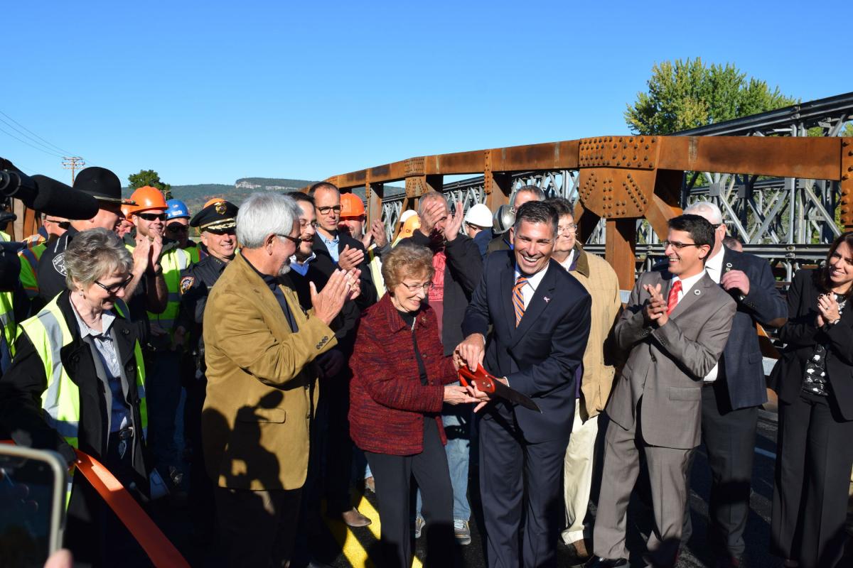 Photos of ribbon cutting at Carmine Liberta Memorial Bridge – County Executive Mike Hein is joined by Angela Liberta, elected officials, local business owners, members of the community and workers from Ulster County’s Department of Public Works