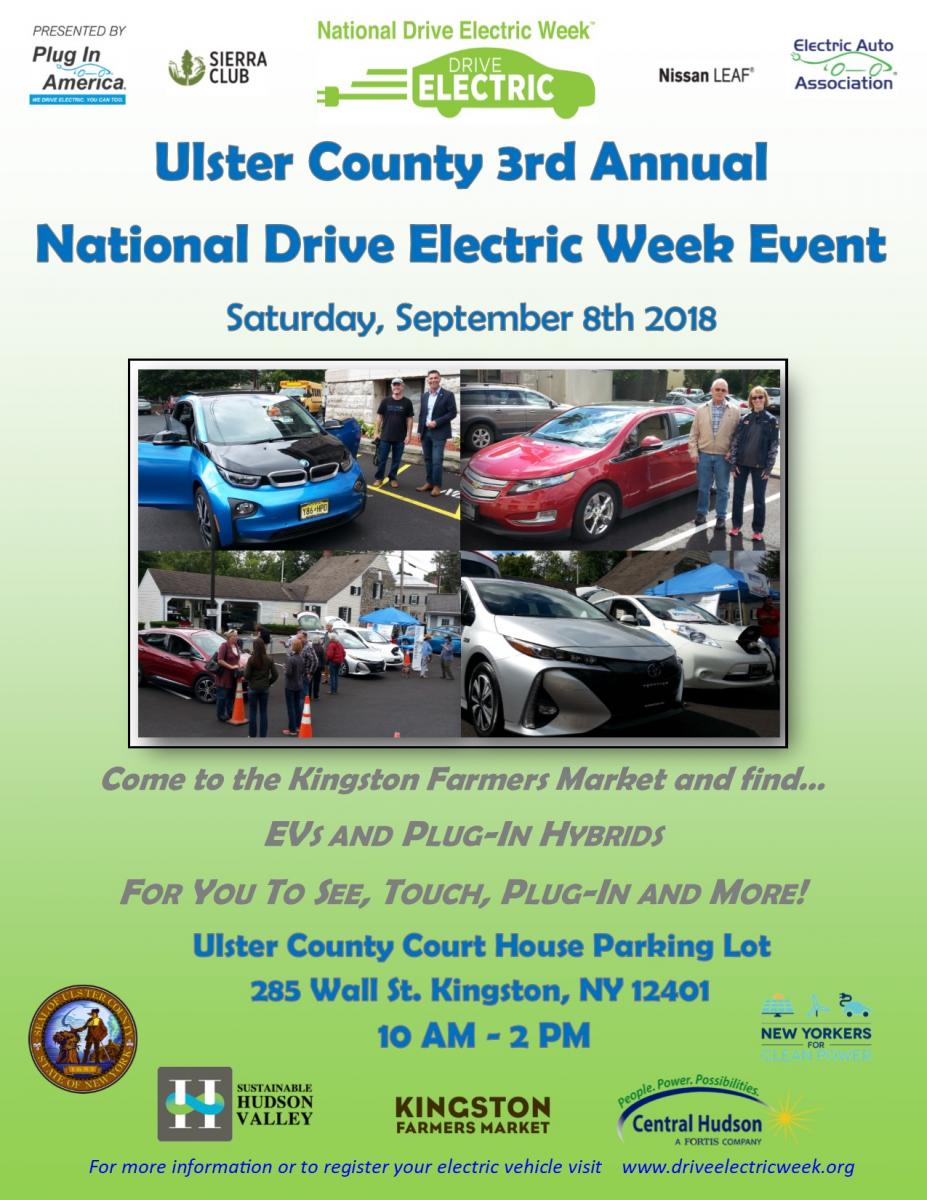 Kingston, NY –Ulster County Executive Mike Hein is pleased to announce that Ulster County is co-sponsoring its third National Drive Electric Week event. It will be held on Saturday, September 8th from 10am-2pm in the Ulster County Courthouse parking lot, 285 Wall Street in Kingston, New York. The local Drive Electric Week Event is co-sponsored by Sustainable Hudson Valley, the Kingston Farmer’s Market, New Yorkers for Clean Power and Central Hudson. The event is free to attend.