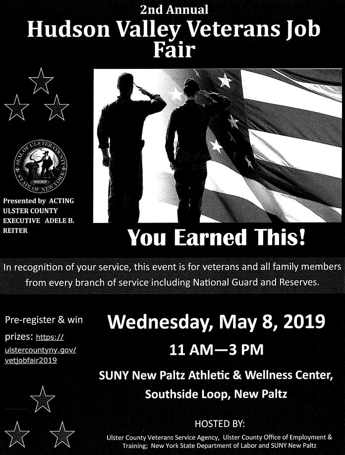 NEW PALTZ, N.Y. – Acting Ulster County Executive Adele B. Reiter announces that the second annual Hudson Valley Veterans Job Fair will take place this Wednesday, May 8th from 11am to 3pm at the SUNY New Paltz Athletic and Wellness Center. Veterans from every branch of military service, including National Guard and Reserves, are welcomed to visit with employers from throughout the Hudson Valley.