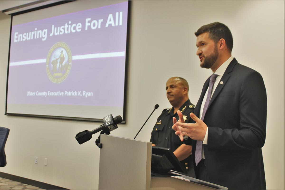Photo (below): Ulster County Executive Pat Ryan and Sheriff Juan Figueroa at the podium explaining steps to protect immigrant rights and resist cooperation with federal immigration policies.